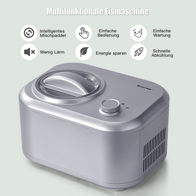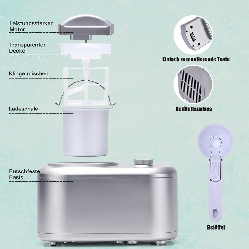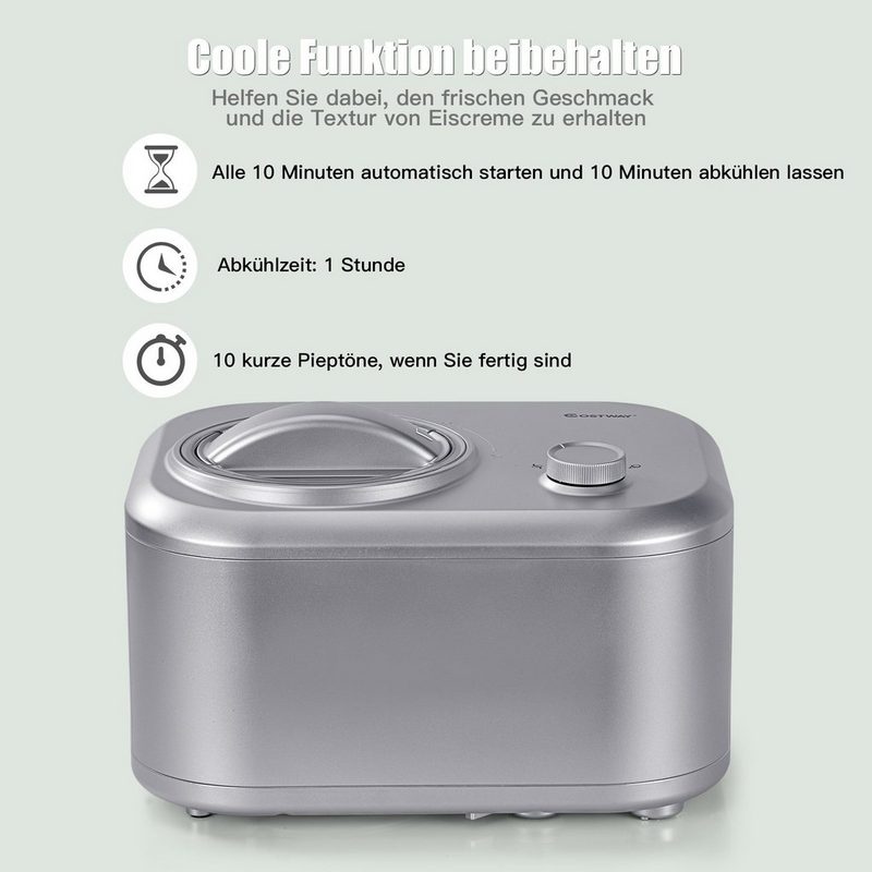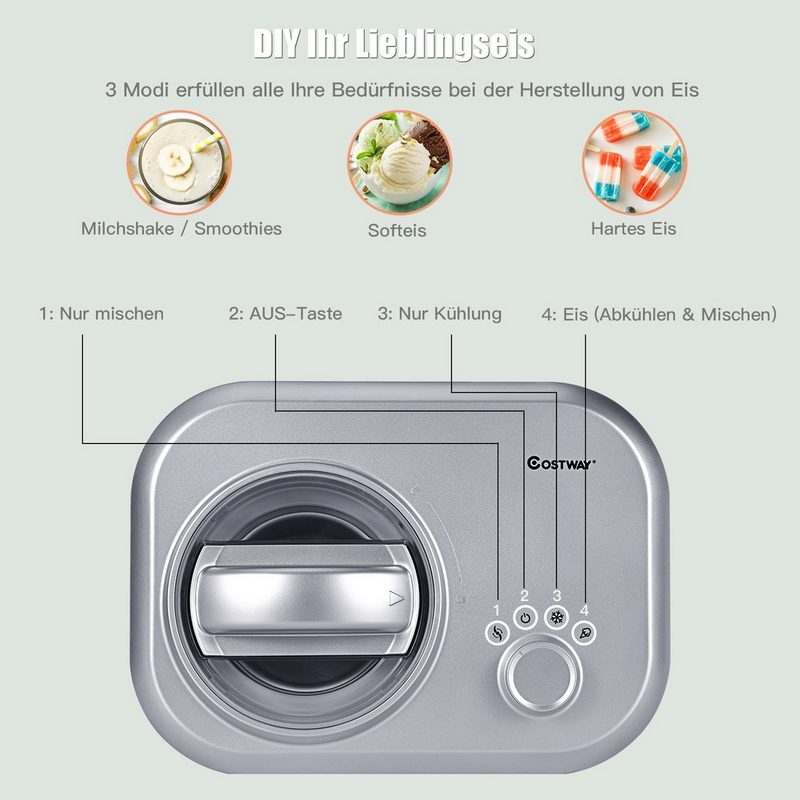 Sie hat drei Betriebsmodi, aus denen Sie je nach Bedarf auswählen können, indem Sie am Knopf drehen. Durch die Kühlfunktion wird frisches Eis 60 Minuten lang gekühlt. Danach gibt die Maschine 10 kurze Pieptöne von sich und schaltet sich automatisch ab. Ausgestattet mit einem Kompressor- und Motorschutz ist ihre lange Nutzungsdauer garantiert, und da alle Teile abnehmbar sind, ist die Reinigung einfach. Mit ihr können Sie jegliche Früchte und Süßigkeiten in eine leckeren Eiscreme verwandeln!
