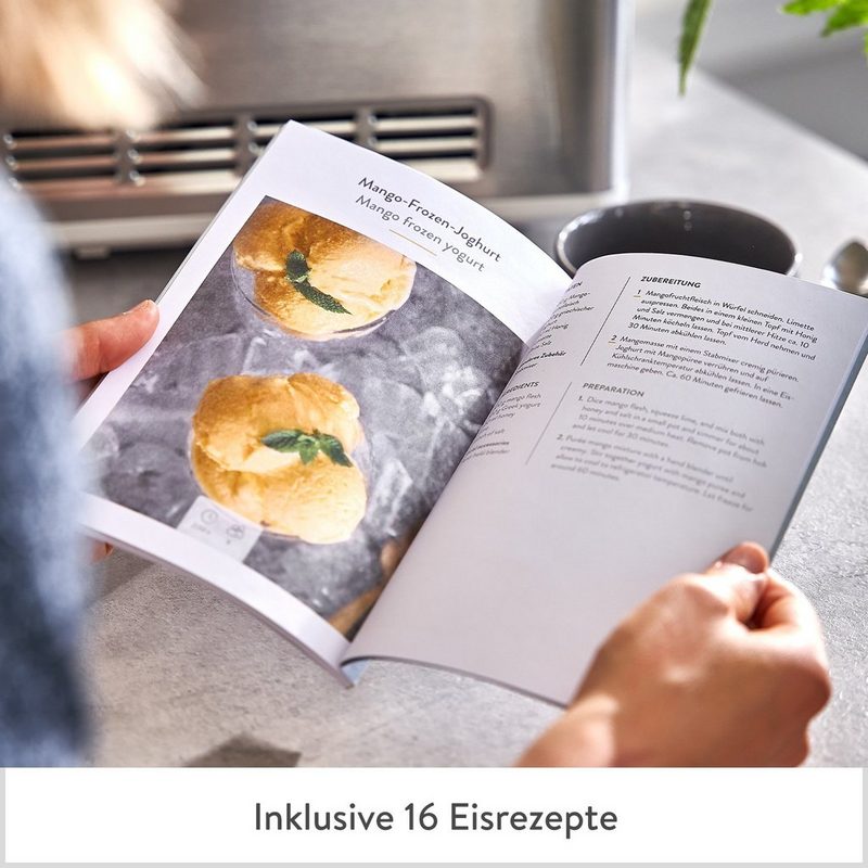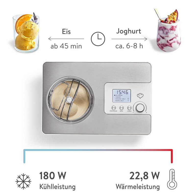 Bequeme Zubereitung dank leistungsstarker Technik – Vor der Eiszubereitung muss der Behälter gekühlt werden? Nicht bei Elisa, denn dank integriertem Kompressor kannst du sofort mit der Zubereitung beginnen. Mit 180 Watt Kühlleistung (Gefrierbereich -18 bis -35 °C) bzw. 22,8 Watt Wärmeleistung sorgt der Motor für kristallfreies Eis und cremige Joghurtergebnisse.