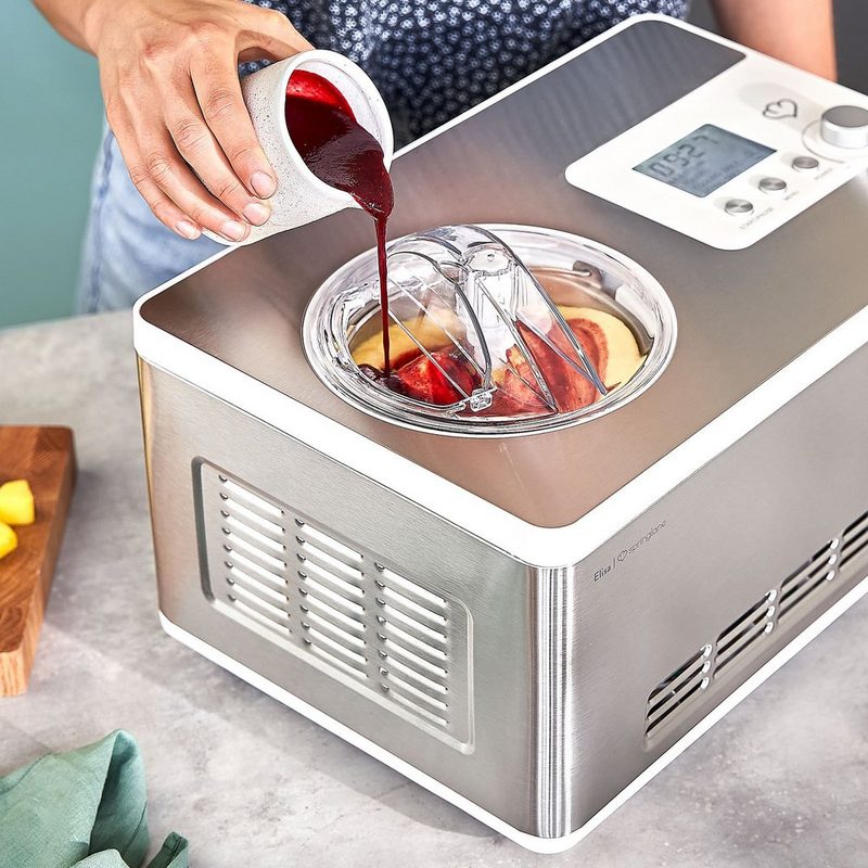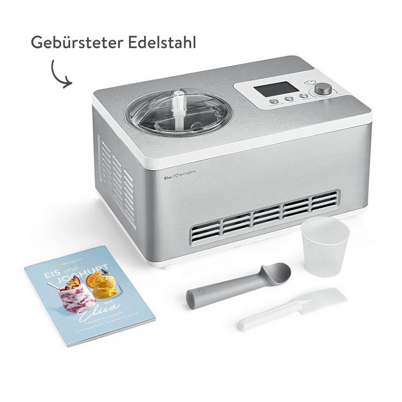 Springlane Eismaschine Elisa 2 l 180 W Eismaschine mit Kompressor 2 l – Eiscrememaschine 180 Watt aus Edelstahl mit herausnehmbaren Eisbehälter & Joghurtbereiter – Eiscremebereiter selbstkühlend inklusive Rezeptheft + vier Aufbewahrungsbehälter in Grau