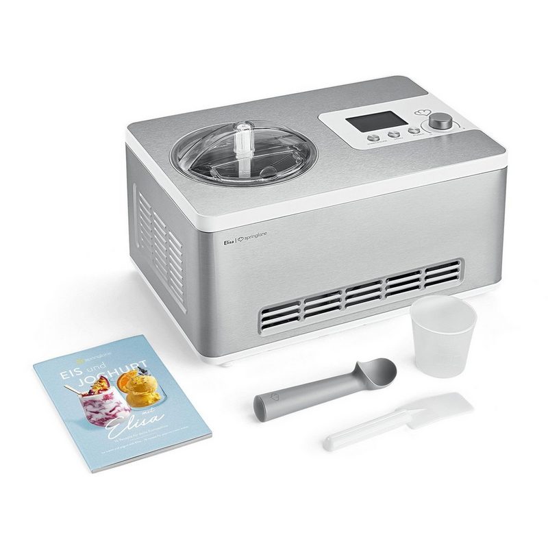 Springlane Eismaschine Elisa 2 l 180 W Eismaschine mit Kompressor 2 l – Eiscrememaschine 180 Watt aus Edelstahl mit herausnehmbaren Eisbehälter & Joghurtbereiter – Eiscremebereiter selbstkühlend inklusive Rezeptheft + Zusatzbehälter aus Edelstahl